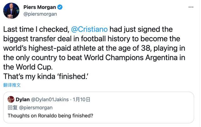 然而对于C罗的解释,很多球迷并不买账,有球迷在社交媒体上向采访过C罗的皮尔斯·摩根提问,加盟沙特后,C罗作为一名顶尖球员的生涯已经完蛋了吗?一向维护C罗的摩根如此回应:“据我所知,C罗刚刚签下了一份足球历史上最大的转会合同,他在38岁的年龄成为了世界上收入最高的运动员,效力一个在世界杯上唯一击败过世界冠军阿根廷的国家的联赛。这就是我所谓的‘完蛋’。”